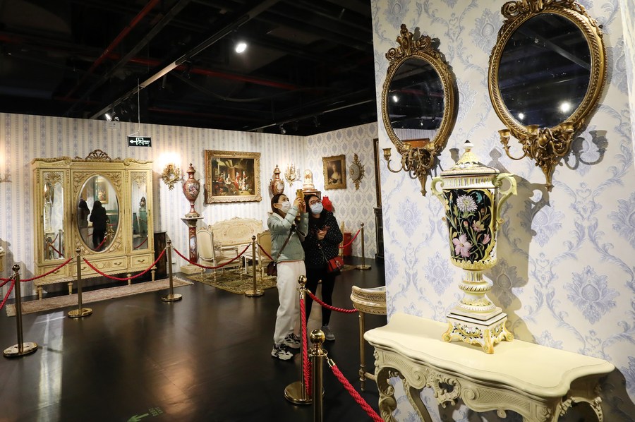Visitors admire French traditional furniture during an exhibition in Shanghai, east China, March 12, 2021. A China itinerant exhibition of Versailles Palace is held at Xintiandi commercial complex in Shanghai, during which digital technologies and interactive activities offer people the unique experience of visiting the palace. (Xinhua/Fang Zhe)