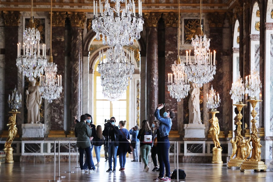 People visit the Galerie des Glaces (Hall of Mirrors) of the Chateau de Versailles (Palace of Versailles) on its reopening day near Paris, France, on June 6, 2020. (Xinhua/Gao Jing)