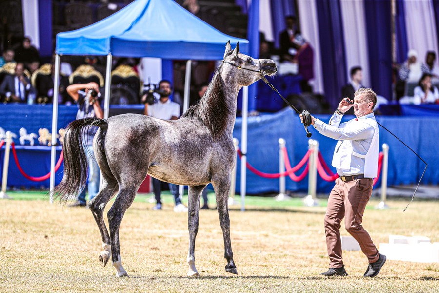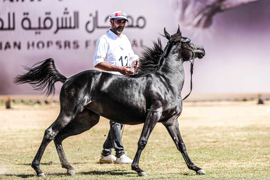 A breeder leads a horse at an Arabian horse beauty contest during the Sharqia Arabian Horses Festival in Sharqia province, Egypt, Sept. 28, 2023. The three-day horse festival started on Wednesday here with the participation of 104 Arabian horses. (Xinhua/Ahmed Gomaa)