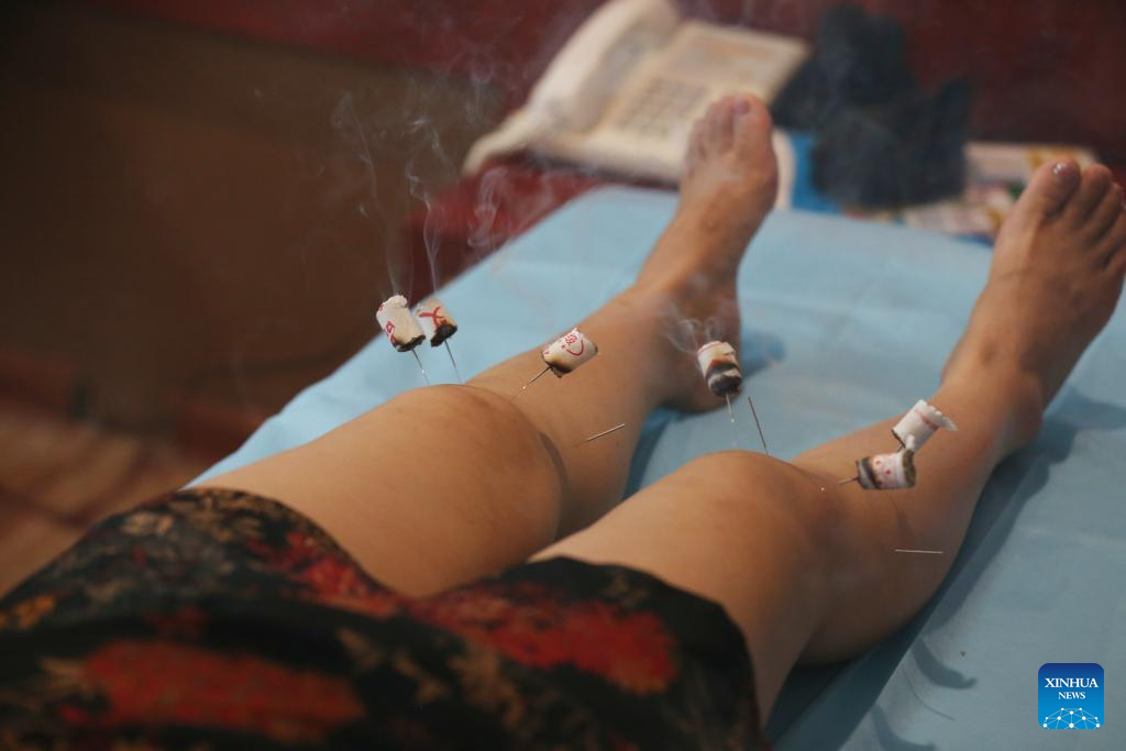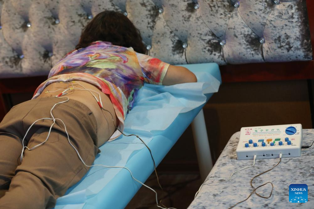 A patient receives acupuncture treatment at a temporary clinic in Yangon, Myanmar, Sept. 28, 2023. A team of Traditional Chinese Medicine (TCM) practitioners from China on Thursday provided free medical services to people in Myanmar's largest city Yangon. (Xinhua/Myo Kyaw Soe)