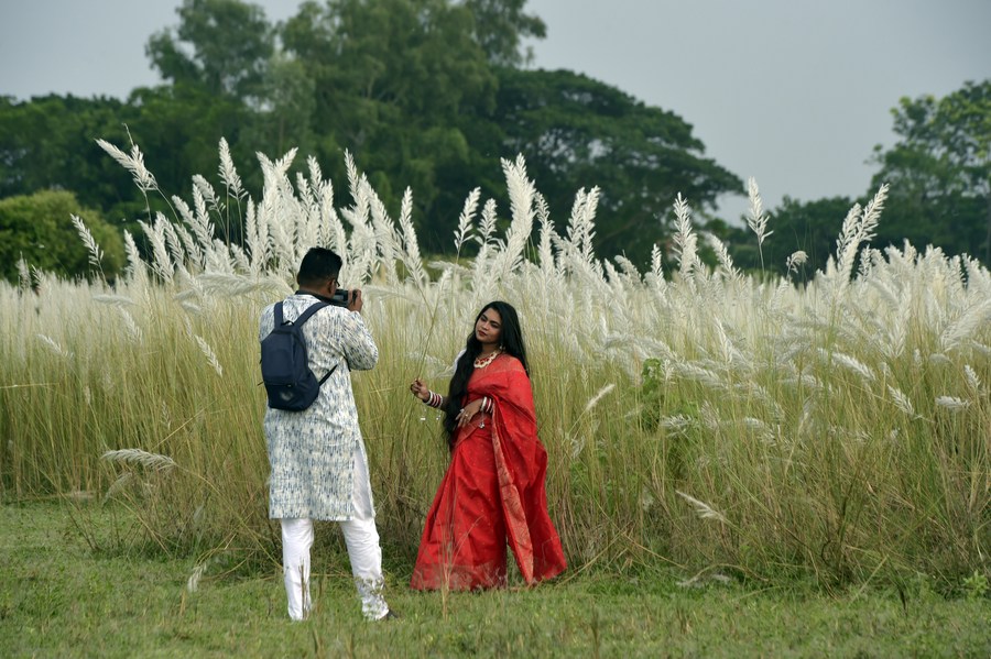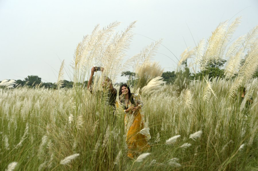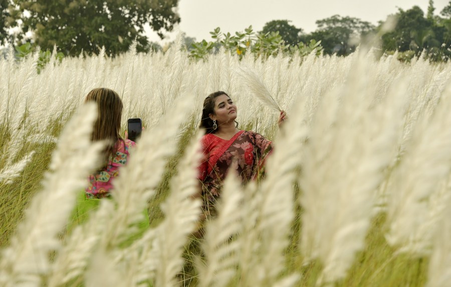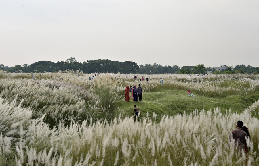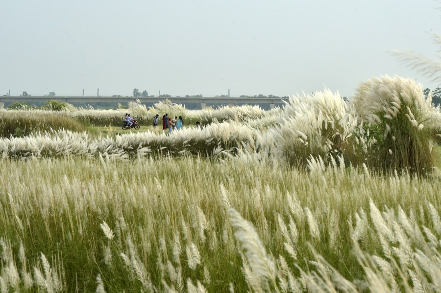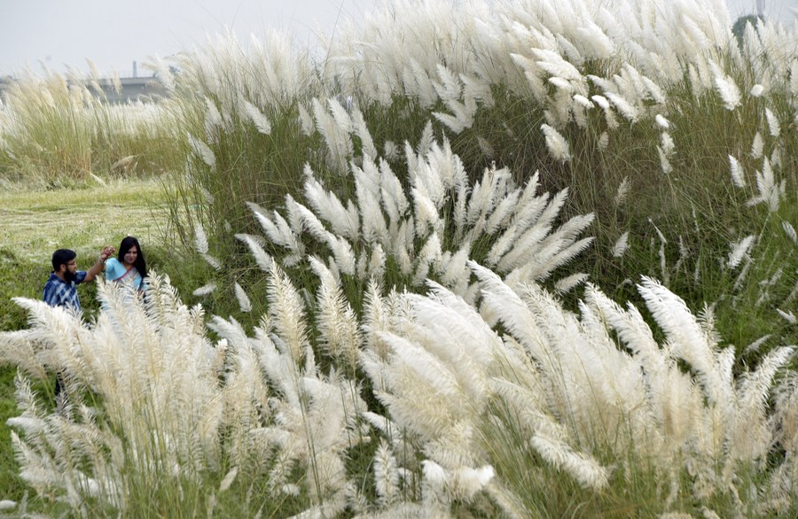 People enjoy beautiful Kans Grass flowers in Dhaka, Bangladesh on Sept. 28, 2023. (Xinhua)