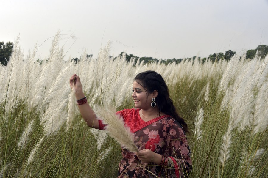 A woman enjoys beautiful Kans Grass flower in Dhaka, Bangladesh on Sept. 28, 2023. (Xinhua)
