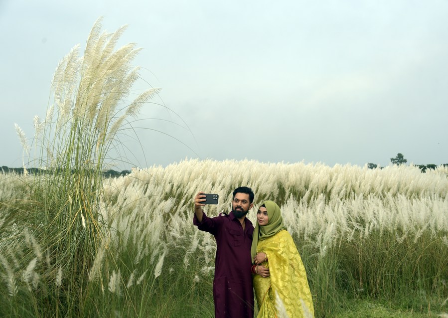 A man takes selfie with a woman in front of Kans Grass flower in Dhaka, Bangladesh on Sept. 28, 2023. (Xinhua) ■