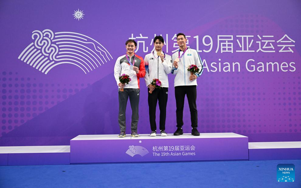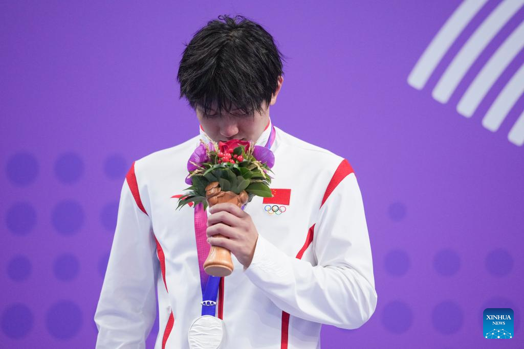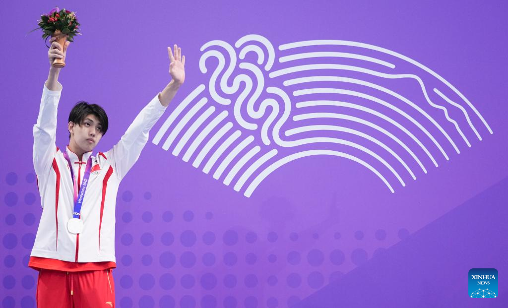 Silver Medalist Fei Liwei of China attends the awarding ceremony for Men's 800m Freestyle of Swimming at the 19th Asian Games in Hangzhou, east China's Zhejiang Province, Sept. 28, 2023. (Xinhua/Xue Yuge)