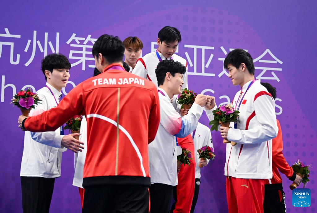 Medalists greet each other after the awarding ceremony for the Men's 4x100m Freestyle Relay of Swimming at the 19th Asian Games in Hangzhou, east China's Zhejiang Province, Sept. 28, 2023. (Xinhua/Xue Yuge)