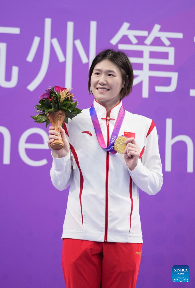 Gold Medalist Ye Shiwen of China attends the awarding ceremony for Women's 200m Breaststroke of Swimming at the 19th Asian Games in Hangzhou, east China's Zhejiang Province, Sept. 28, 2023. (Xinhua/Xue Yuge)