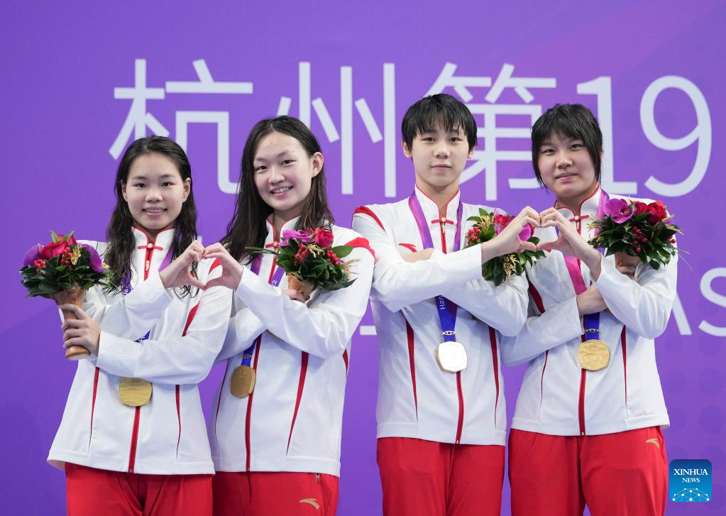 Gold Medalists Team China attend the awarding ceremony for the Women's 4x200m Freestyle Relay of Swimming at the 19th Asian Games in Hangzhou, east China's Zhejiang Province, Sept. 28, 2023. (Xinhua/Xue Yuge)