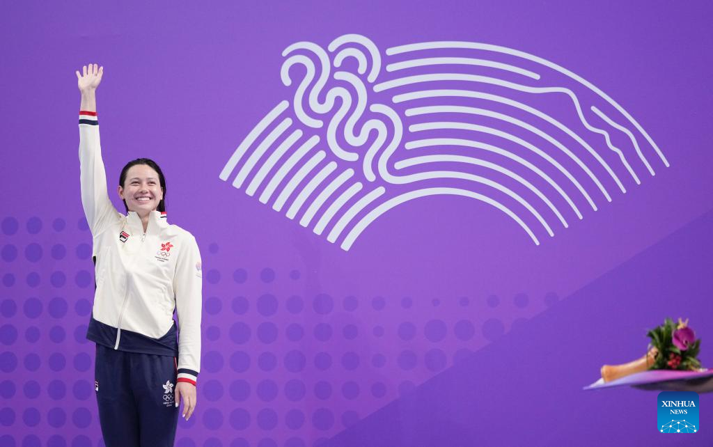 Silver Medalist Haughey Siobhan Bernadette of China's Hong Kong attends the awarding ceremony for Women's 50m Freestyle of Swimming at the 19th Asian Games in Hangzhou, east China's Zhejiang Province, Sept. 28, 2023. (Xinhua/Xue Yuge)