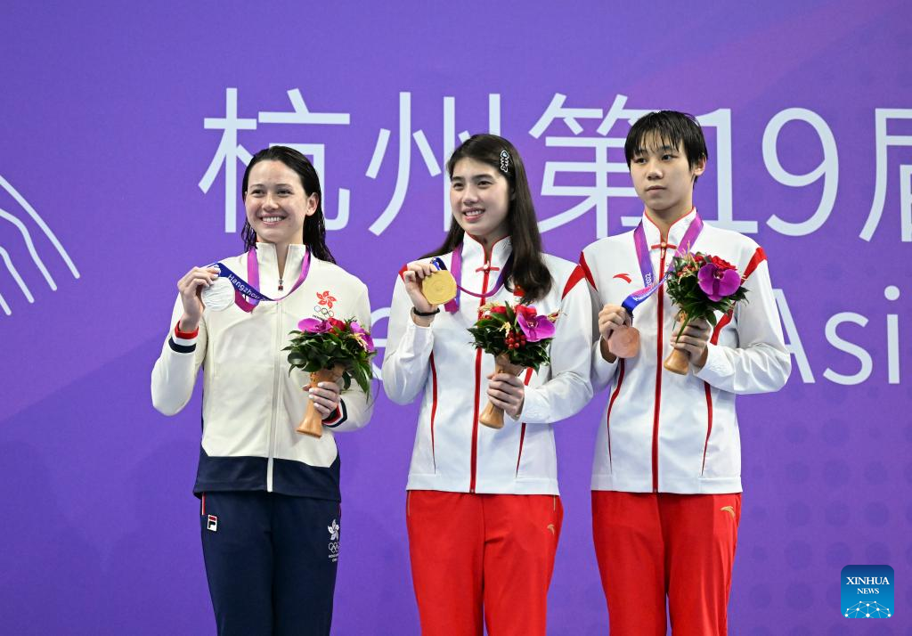 Gold Medalist Zhang Yufei (C) of China, Silver Medalist Haughey Siobhan Bernadette (L) of China's Hong Kong and Bronze Medalist Cheng Yujie of China attend the awarding ceremony for Women's 50m Freestyle of Swimming at the 19th Asian Games in Hangzhou, east China's Zhejiang Province, Sept. 28, 2023. (Xinhua/Xue Yuge)