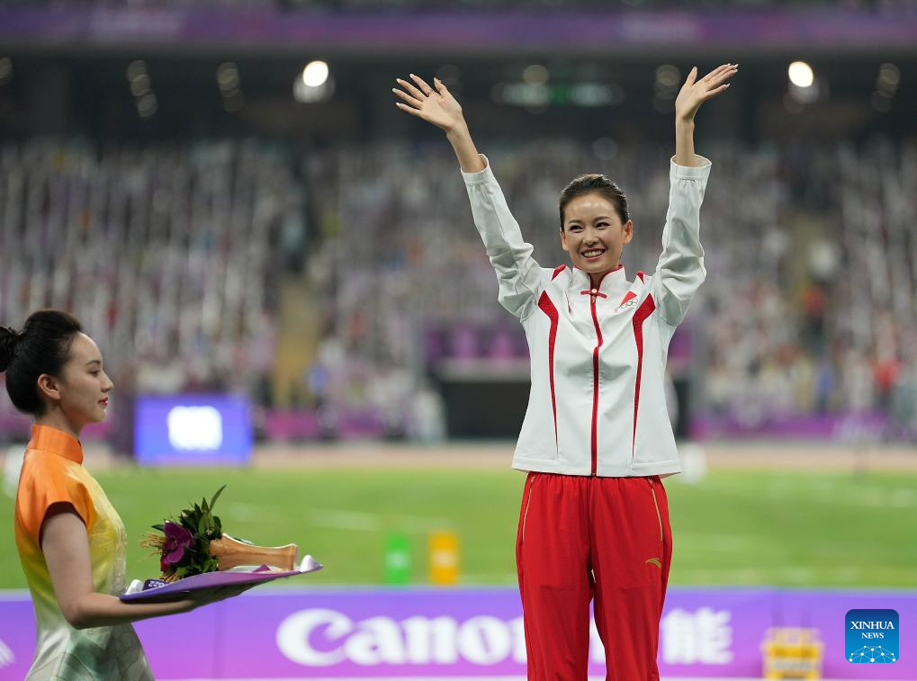 Gold medalist Yang Jiayu of China reacts during the awarding ceremony for the Women's 20km Race Walk of Athletics at the 19th Asian Games in Hangzhou, east China's Zhejiang Province, Sept. 29, 2023. (Xinhua/Sun Fei)