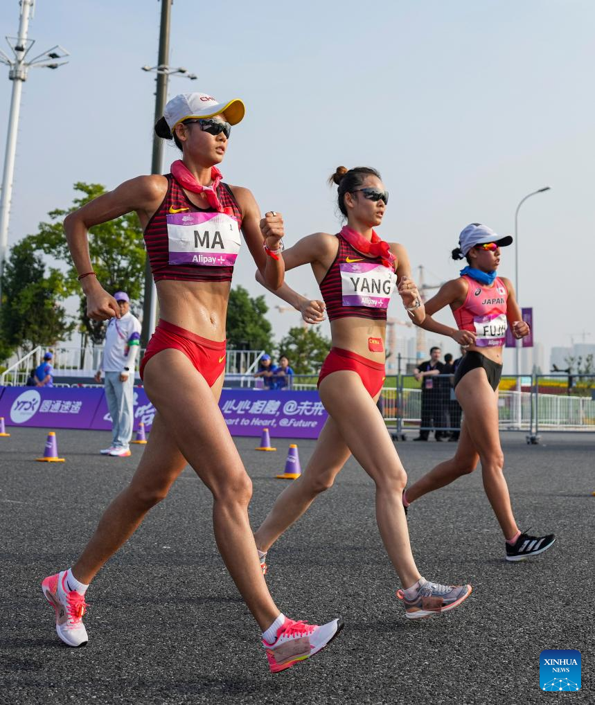 Yang Jiayu (L, front) and Ma Zhenxia (C, front) of China compete during Women's 20km Race Walk of Athletics at the 19th Asian Games in Hangzhou, east China's Zhejiang Province, Sept. 29, 2023. (Xinhua/Jiang Han)