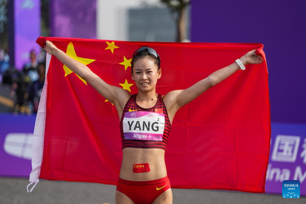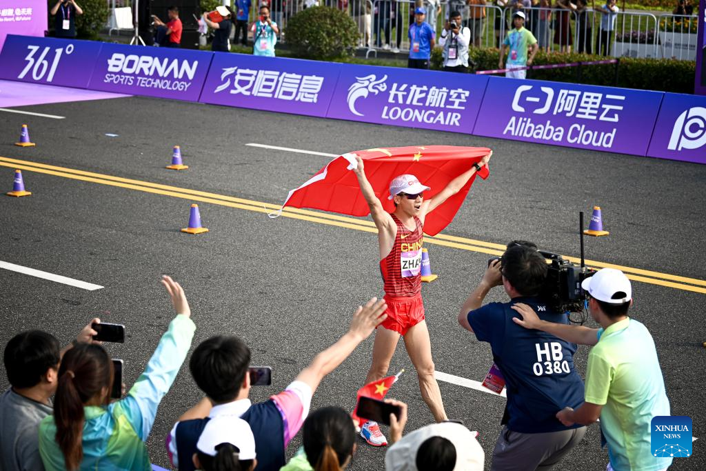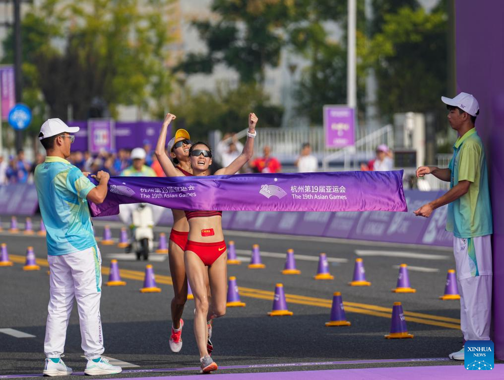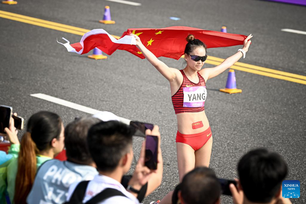 Yang Jiayu of China celebrates after the Women's 20km Race Walk of Athletics at the 19th Asian Games in Hangzhou, east China's Zhejiang Province, Sept. 29, 2023. (Xinhua/Sun Fei)