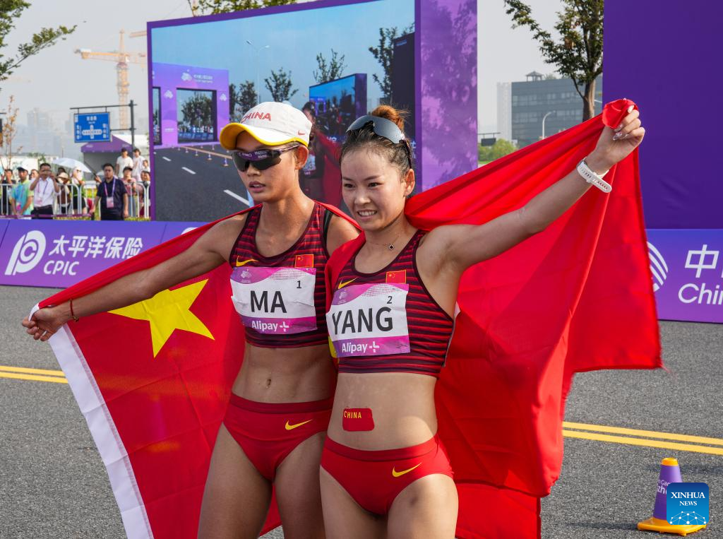 Yang Jiayu (R) and Ma Zhenxia of China celebrate after the Women's 20km Race Walk of Athletics at the 19th Asian Games in Hangzhou, east China's Zhejiang Province, Sept. 29, 2023. (Xinhua/Sun Fei)