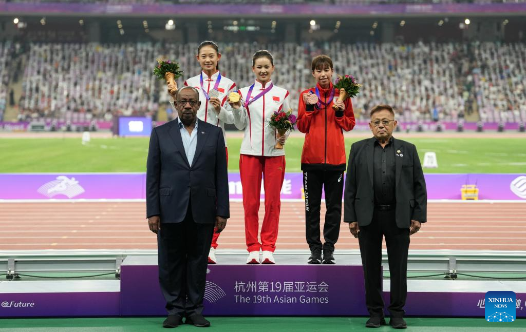 Gold medalist Yang Jiayu (C, rear) of China, Silver medalist Ma Zhenxia (L, rear) of China and Bronze medalist Fujii Nanako (R, rear) of Japan are pictured during the awarding ceremony for the Women's 20km Race Walk of Athletics at the 19th Asian Games in Hangzhou, east China's Zhejiang Province, Sept. 29, 2023. (Xinhua/Sun Fei)