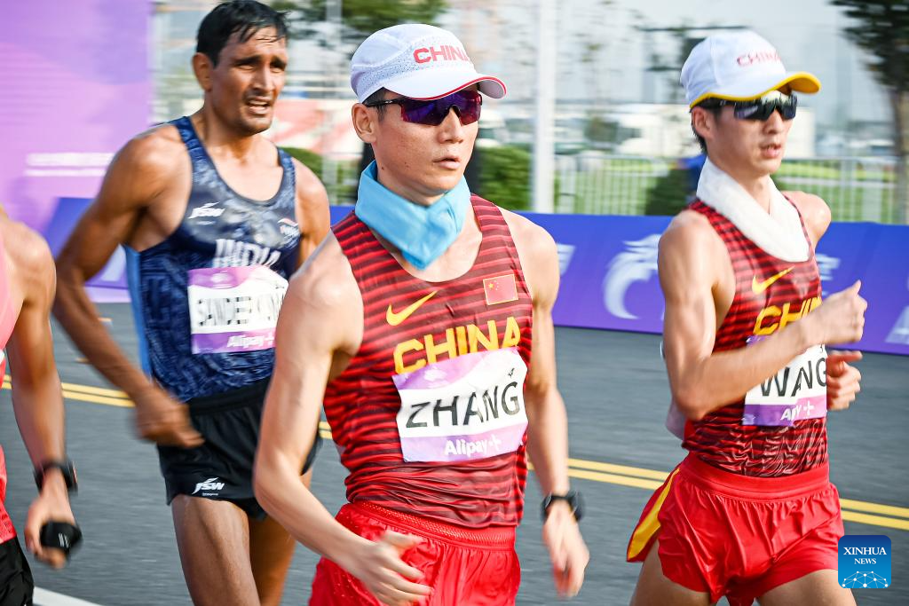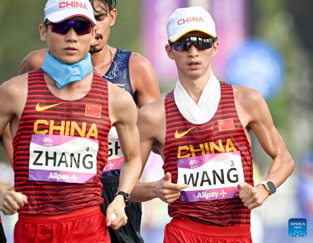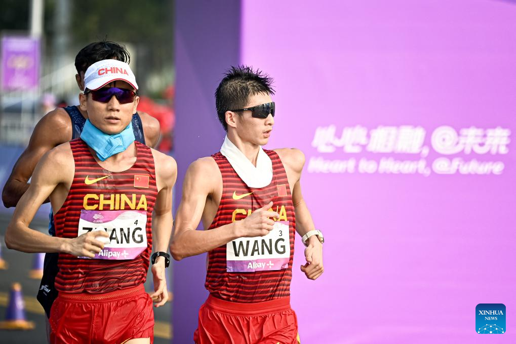 Wang Zhaozhao (R) and Zhang Jun (C) of China compete during the Men's 20km Race Walk of Athletics at the 19th Asian Games in Hangzhou, east China's Zhejiang Province, Sept. 29, 2023. (Xinhua/Jiang Han)