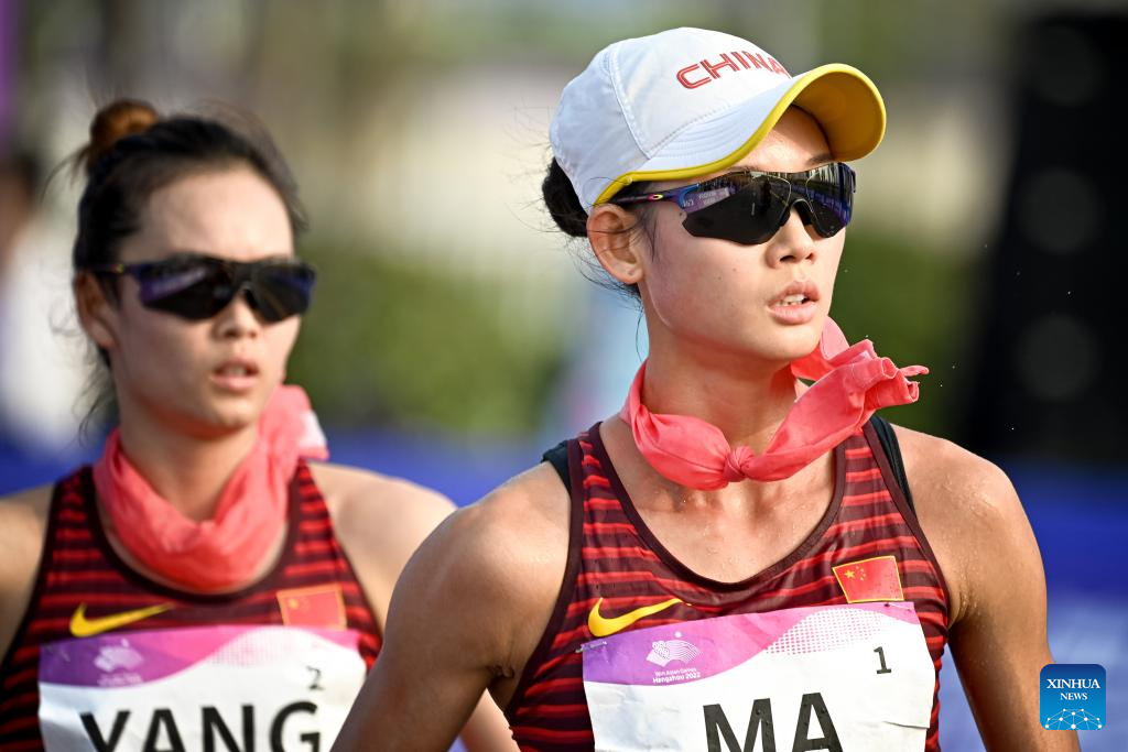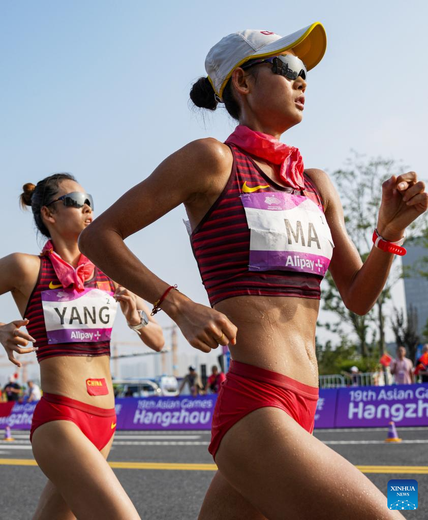 Yang Jiayu (R) and Ma Zhenxia of China compete during the Women's 20km Race Walk of Athletics at the 19th Asian Games in Hangzhou, east China's Zhejiang Province, Sept. 29, 2023. (Xinhua/Sun Fei)