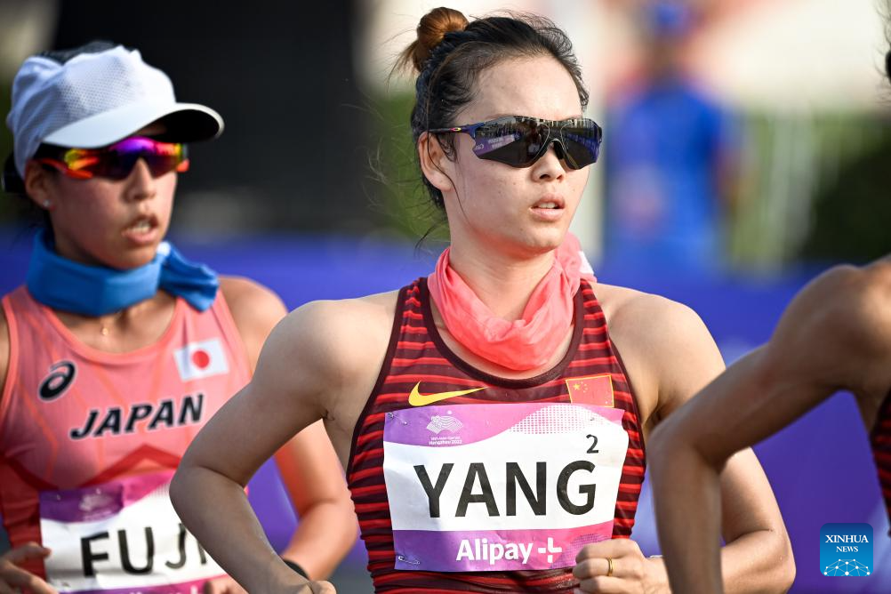 Yang Jiayu of China competes during the Women's 20km Race Walk of Athletics at the 19th Asian Games in Hangzhou, east China's Zhejiang Province, Sept. 29, 2023. (Xinhua/Sun Fei)