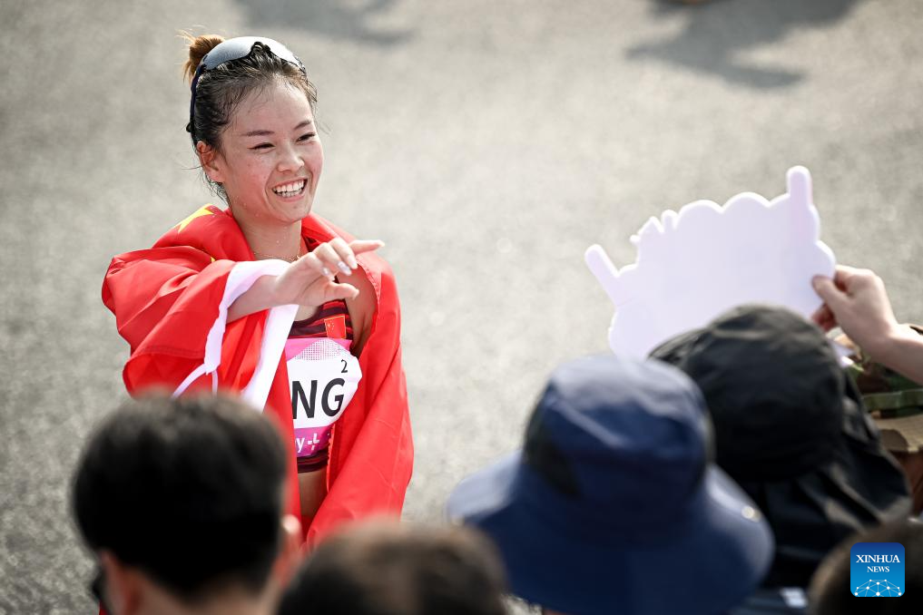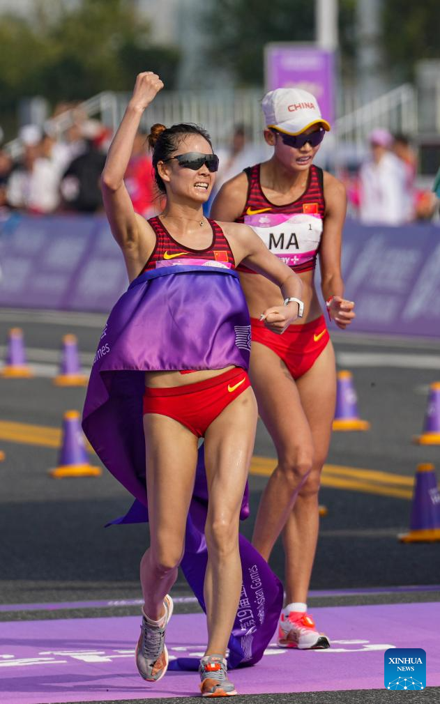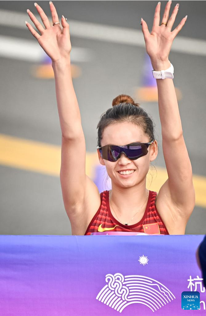 Yang Jiayu of China celebrates after the Women's 20km Race Walk of Athletics at the 19th Asian Games in Hangzhou, east China's Zhejiang Province, Sept. 29, 2023. (Xinhua/Jiang Han)