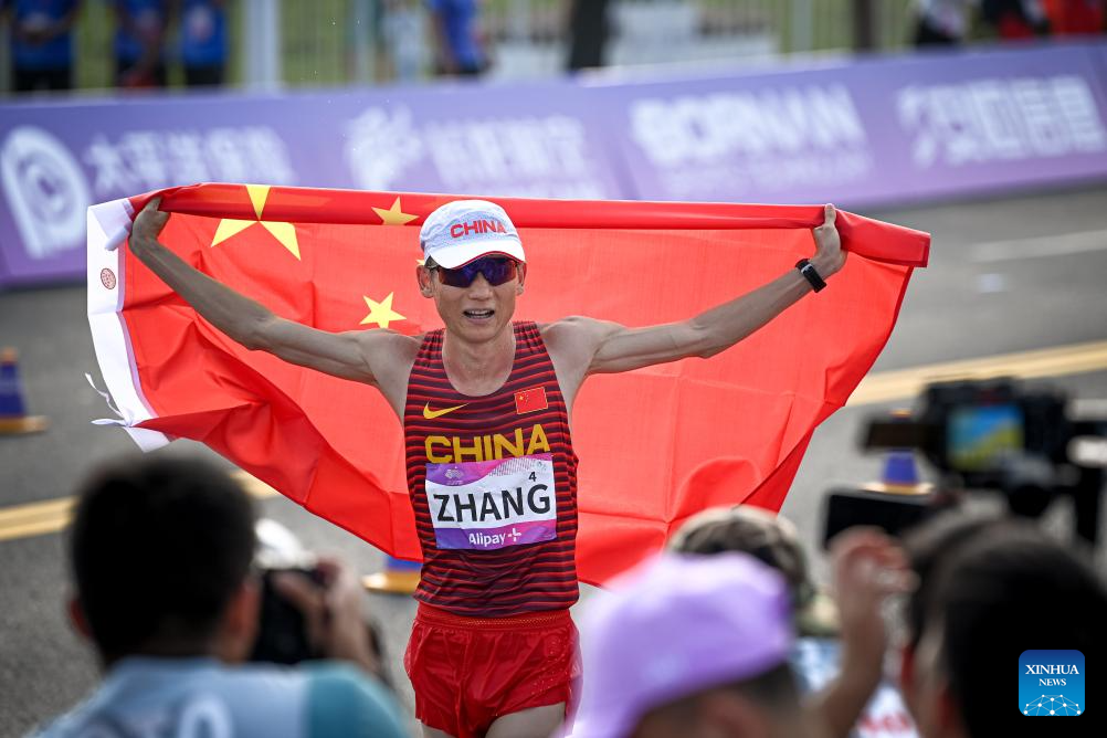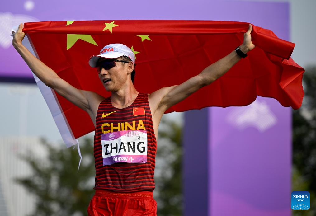 Gold medalist Zhang Jun celebrates after the Men's 20km Race Walk of Athletics at the 19th Asian Games in Hangzhou, east China's Zhejiang Province, Sept. 29, 2023. (Xinhua/Song Yanhua)