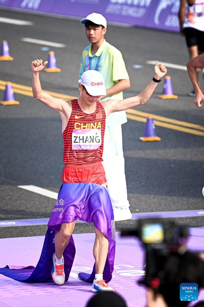 Zhang Jun of China celebrates after the Men's 20km Race Walk of Athletics at the 19th Asian Games in Hangzhou, east China's Zhejiang Province, Sept. 29, 2023. (Xinhua/Jiang Han)
