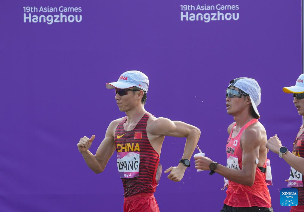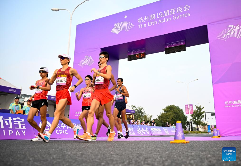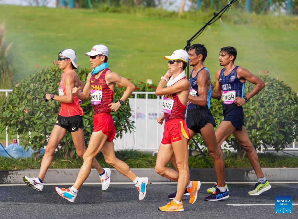 Athletes compete during the Men's 20km Race Walk of Athletics at the 19th Asian Games in Hangzhou, east China's Zhejiang Province, Sept. 29, 2023. (Xinhua/Sun Fei)
