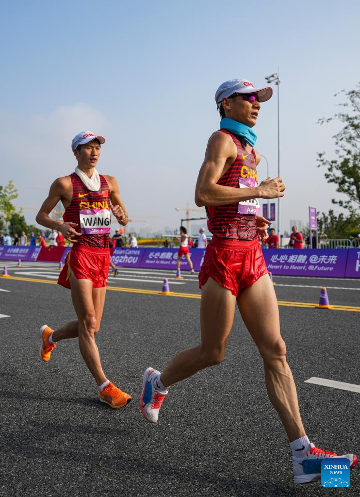 Wang Zhaozhao (R) and Zhang Jun of China compete during the Men's 20km Race Walk of Athletics at the 19th Asian Games in Hangzhou, east China's Zhejiang Province, Sept. 29, 2023. (Xinhua/Jiang Han)