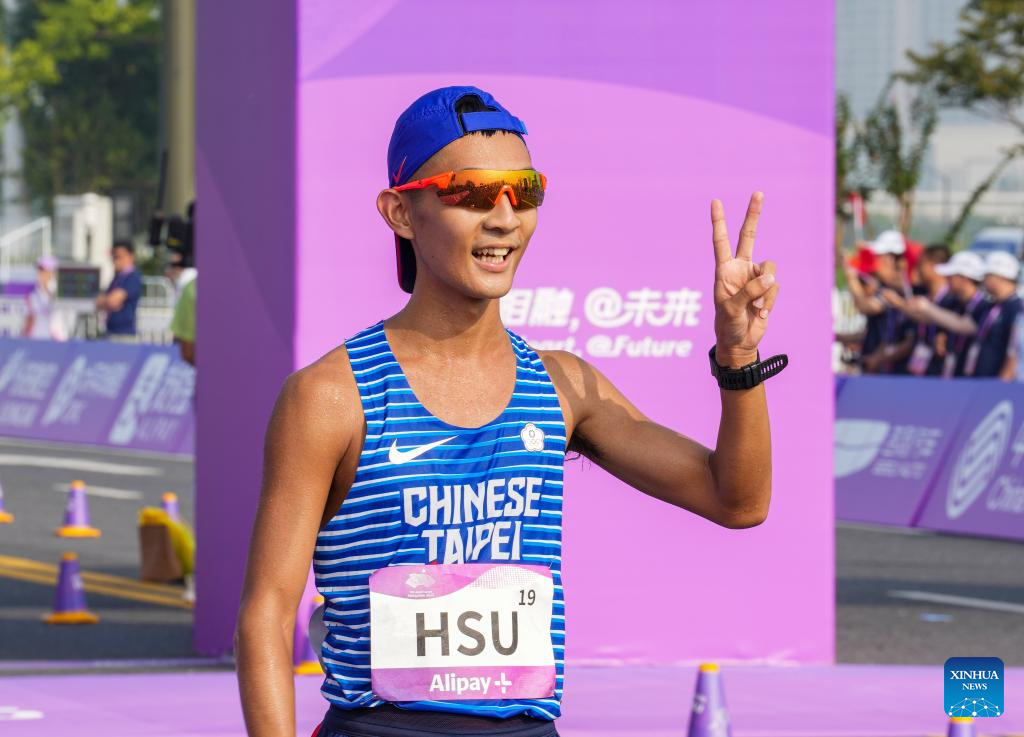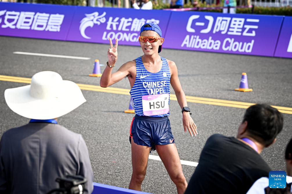 Hsu Chia-Wei of Chinese Taipei celebrates after the Men's 20km Race Walk of Athletics at the 19th Asian Games in Hangzhou, east China's Zhejiang Province, Sept. 29, 2023. (Xinhua/Sun Fei)