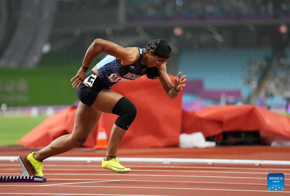 Himanshi Malik of India competes during the Women's 400m Heat of Athletics at the 19th Asian Games in Hangzhou, east China's Zhejiang Province, Sept. 29, 2023. (Xinhua/Sun Fei)
