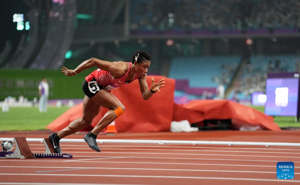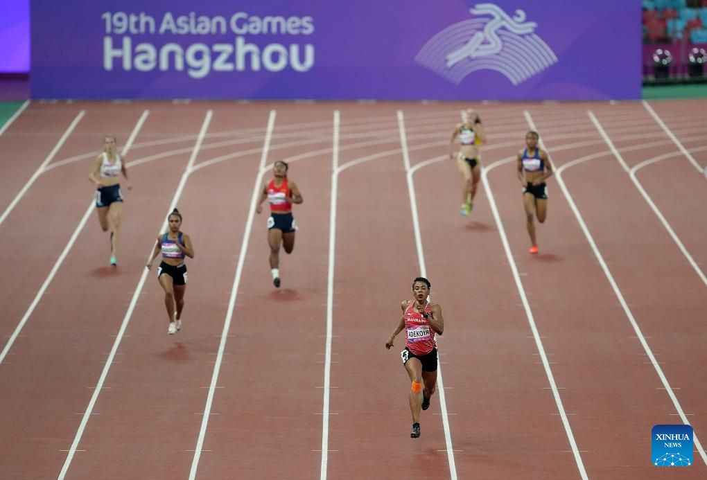 Athletes compete during the Women's 400m Heat of Athletics at the 19th Asian Games in Hangzhou, east China's Zhejiang Province, Sept. 29, 2023. (Xinhua/Jiang Wenyao)