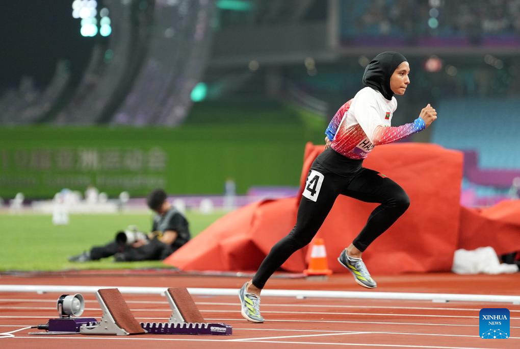 Aishath Himna Hassan of Maldives competes during the Women's 400m Heat of Athletics at the 19th Asian Games in Hangzhou, east China's Zhejiang Province, Sept. 29, 2023. (Xinhua/Sun Fei)