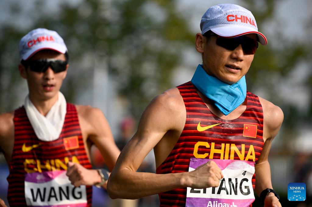Zhang Jun (L) of China competes during the Men's 20km Race Walk of Athletics at the 19th Asian Games in Hangzhou, east China's Zhejiang Province, Sept. 29, 2023. (Xinhua/Sun Fei)