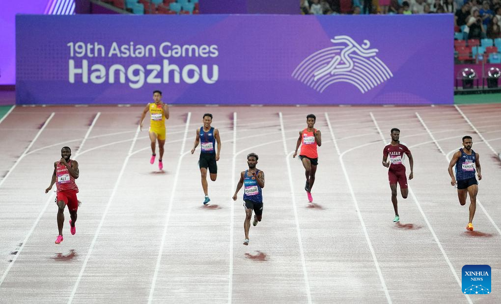 Athletes compete during the Men's 400m Heat of Athletics at the 19th Asian Games in Hangzhou, east China's Zhejiang Province, Sept. 29, 2023. (Xinhua/Jiang Wenyao)