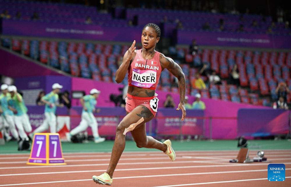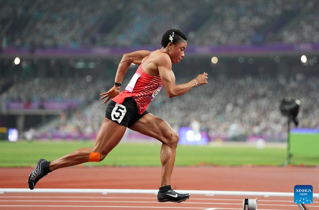 Salwa Eid Naser Naser of Bahrain competes during the Women's 400m Heat of Athletics at the 19th Asian Games in Hangzhou, east China's Zhejiang Province, Sept. 29, 2023. (Xinhua/Sun Fei)