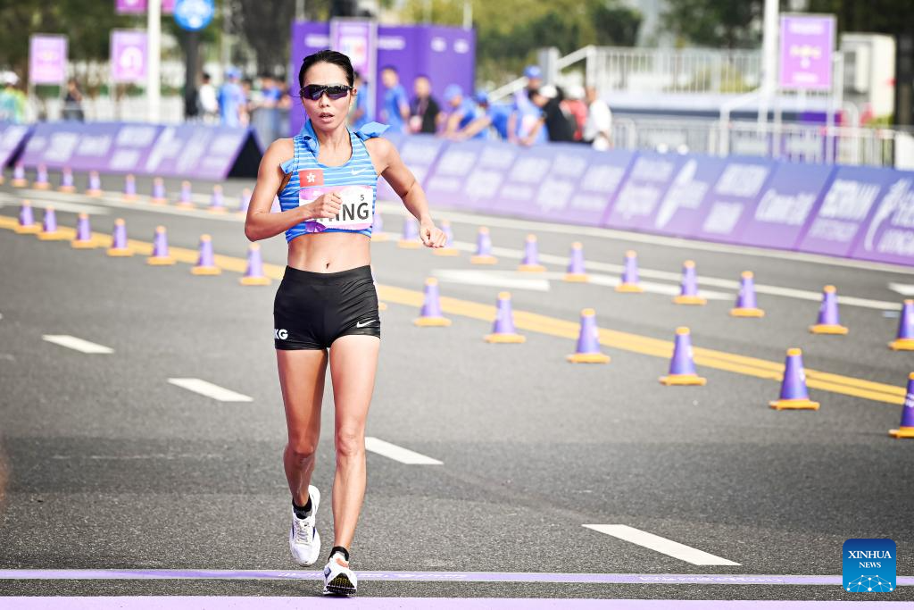 Ching Siu Nga of China's Hong Kong crosses the finish line during the Women's 20km Race Walk of Athletics at the 19th Asian Games in Hangzhou, east China's Zhejiang Province, Sept. 29, 2023. (Xinhua/Jiang Han)