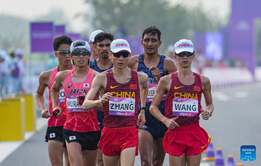 Zhang Jun (C) and Wang Zhaozhao (L) of China compete during the Men's 20km Race Walk of Athletics at the 19th Asian Games in Hangzhou, east China's Zhejiang Province, Sept. 29, 2023. (Xinhua/Sun Fei)