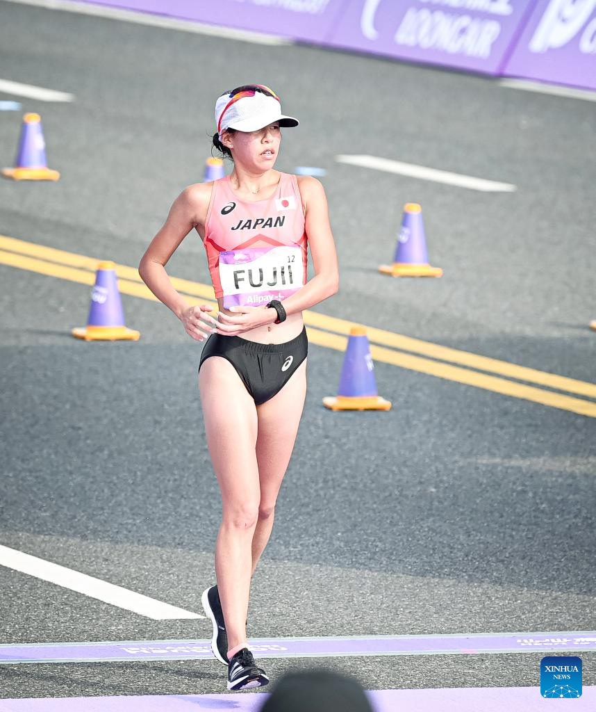 Fujii Nanako of Japan crosses the finish line during the Women's 20km Race Walk of Athletics at the 19th Asian Games in Hangzhou, east China's Zhejiang Province, Sept. 29, 2023. (Xinhua/Jiang Han)