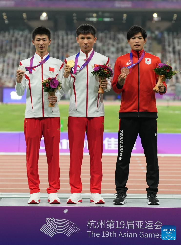 Gold medalist Zhang Jun (C) of China, Silver medalist Wang Zhaozhao (L) of China and Bronze medalist Murayama Yutaro of Japan attend the awarding ceremony for the Men's 20km Race Walk of Athletics at the 19th Asian Games in Hangzhou, east China's Zhejiang Province, Sept. 29, 2023. (Xinhua/Sun Fei)