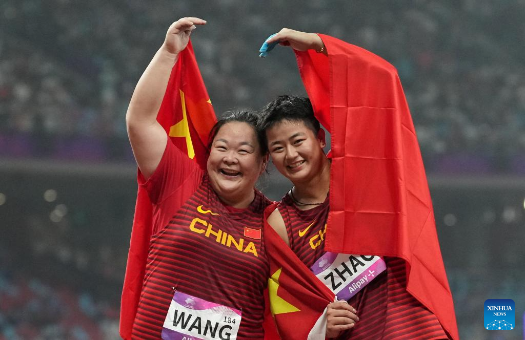 Gold medalist Wang Zheng (L) of China and Silver medalist Zhao Jie of China pose for photos after the Women's Hammer Throw Final of Athletics at the 19th Asian Games in Hangzhou, east China's Zhejiang Province, Sept. 29, 2023. (Xinhua/Sun Fei)