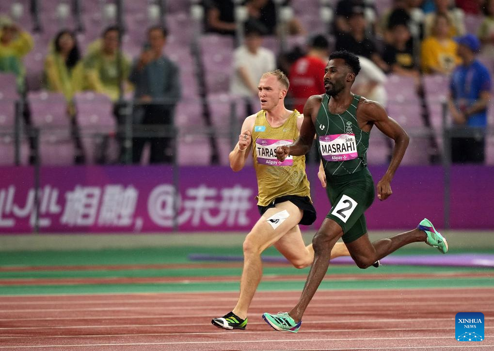 Yousef Ahmed M Masrahi (R) of Saudi Arabia and Yefim Tarassov of Kazakhstan compete during the Men's 400m Heat of Athletics at the 19th Asian Games in Hangzhou, east China's Zhejiang Province, Sept. 29, 2023. (Xinhua/Li Yibo)