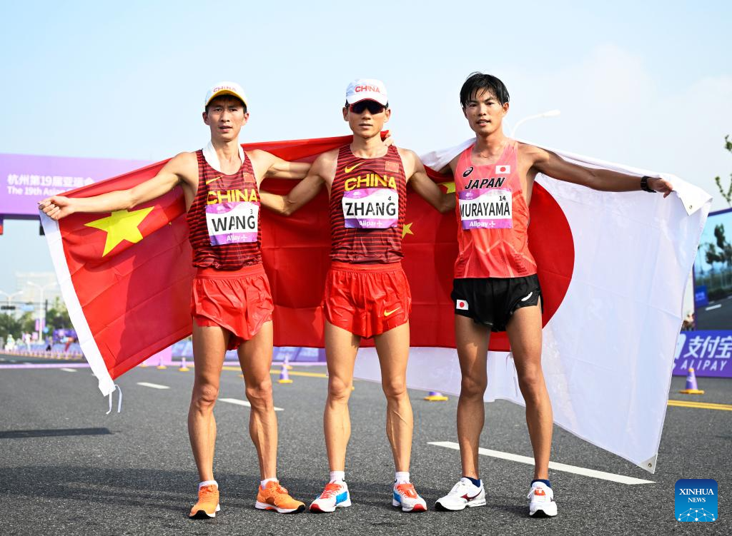 Gold medalist Zhang Jun (C), silver medalist Wang Zhaozhao of China and bronze medalist Murayama Yutaro of Japan pose for photos after the Men's 20km Race Walk of Athletics at the 19th Asian Games in Hangzhou, east China's Zhejiang Province, Sept. 29, 2023. (Xinhua/Song Yanhua)
