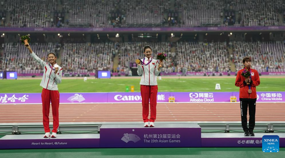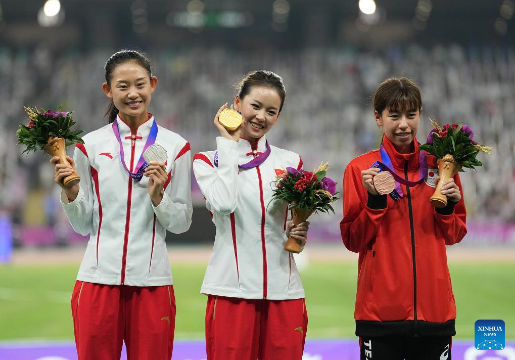 Gold medalist Yang Jiayu (C) of China, Silver medalist Ma Zhenxia (L) of China and Bronze medalist Fujii Nanako of Japan are pictured during the awarding ceremony for the Women's 20km Race Walk of Athletics at the 19th Asian Games in Hangzhou, east China's Zhejiang Province, Sept. 29, 2023. (Xinhua/Sun Fei)