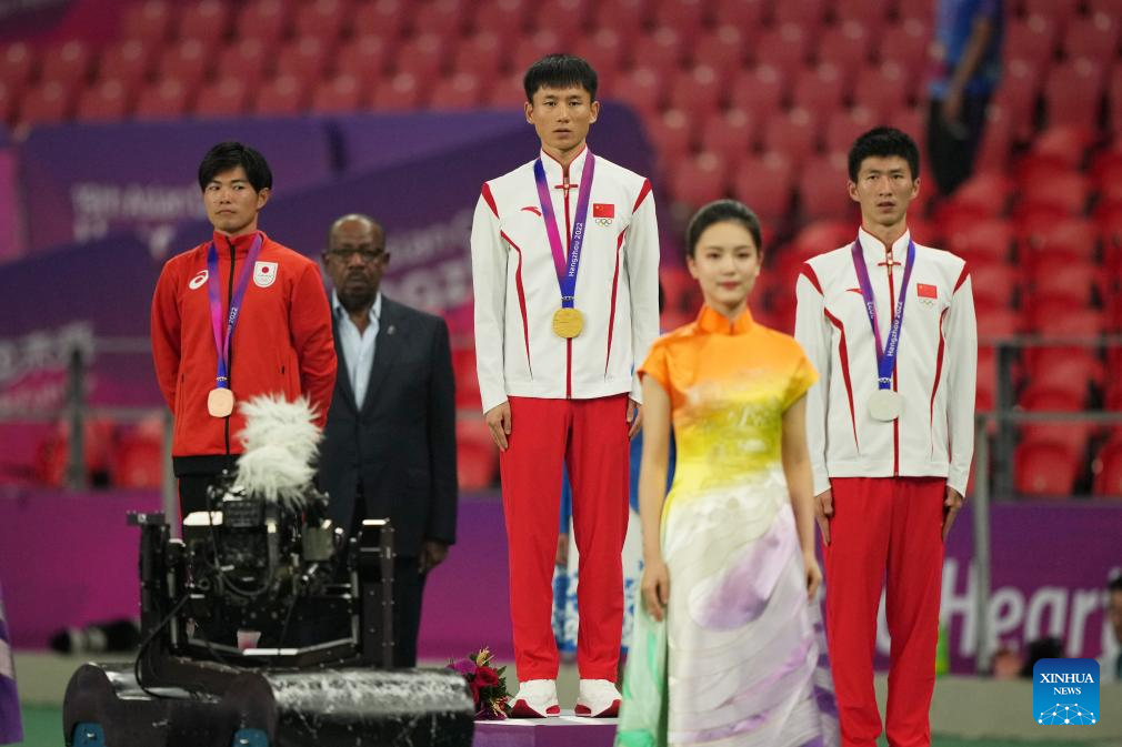 Gold medalist Zhang Jun (C) of China, Silver medalist Wang Zhaozhao (R) of China and Bronze medalist Murayama Yutaro (L) of Japan attend the awarding ceremony for the Men's 20km Race Walk of Athletics at the 19th Asian Games in Hangzhou, east China's Zhejiang Province, Sept. 29, 2023. (Xinhua/Li Yibo)