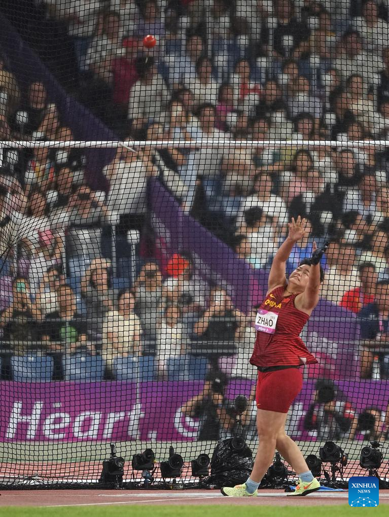 Zhao Jie of China competes during the Women's Hammer Throw Final of Athletics at the 19th Asian Games in Hangzhou, east China's Zhejiang Province, Sept. 29, 2023. (Xinhua/Li Yibo)