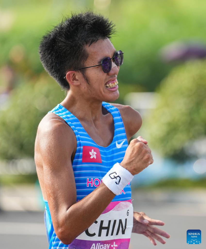 Chin Man Kit of China's Hong Kong competes during the Men's 20km Race Walk of Athletics at the 19th Asian Games in Hangzhou, east China's Zhejiang Province, Sept. 29, 2023. (Xinhua/Sun Fei)