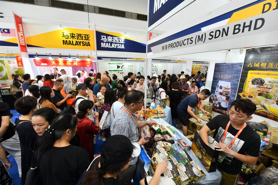 People select goods during the 20th China-ASEAN Expo at Nanning International Convention and Exhibition Center in Nanning, capital of south China's Guangxi Zhuang Autonomous Region, Sept. 19, 2023. (Xinhua/Zhang Ailin)