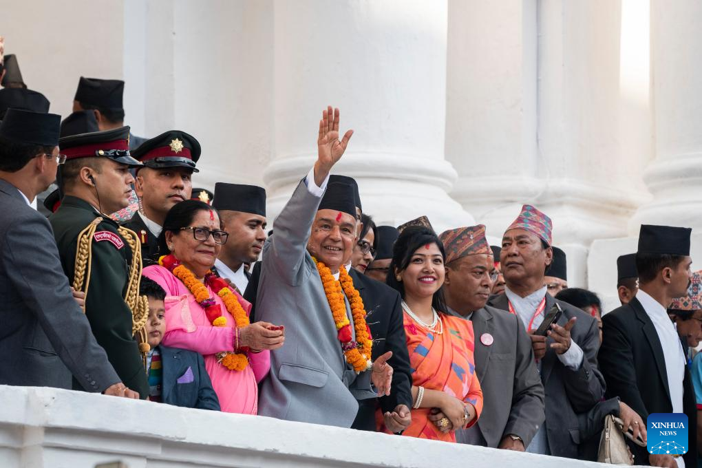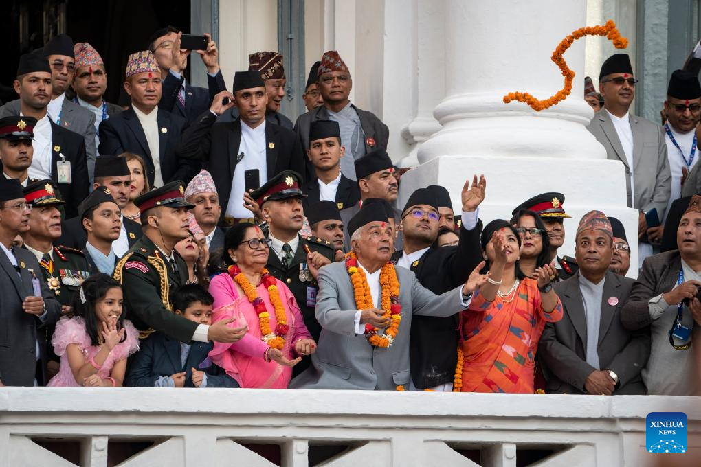 Nepal's President Ram Chandra Poudel observes the chariot procession of the Indra Jatra festival in Kathmandu, Nepal, Sept. 28, 2023. (Photo by Hari Maharjan/Xinhua)