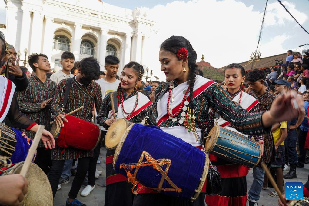Girls in traditional attire play drums during the Indra Jatra festival in Kathmandu, Nepal, Sept. 28, 2023. (Photo by Hari Maharjan/Xinhua)