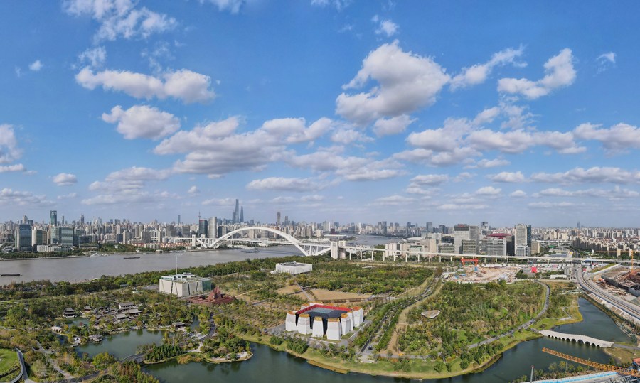This aerial photo taken on Oct. 17, 2022 shows a view of World Expo culture park at the China (Shanghai) Pilot Free Trade Zone in east China's Shanghai. (Xinhua/Fang Zhe)