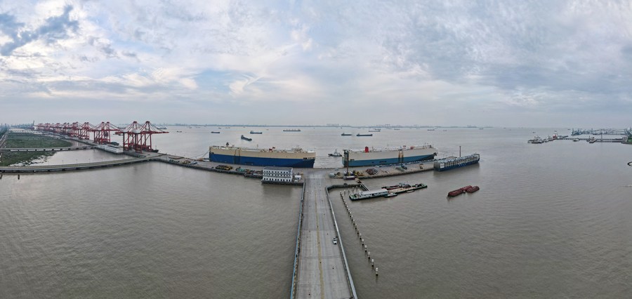This aerial photo taken on July 9, 2023 shows a view of the Shanghai Haitong International Automotive Terminal in Waigaoqiao of east China's Shanghai. (Xinhua/Fang Zhe)
