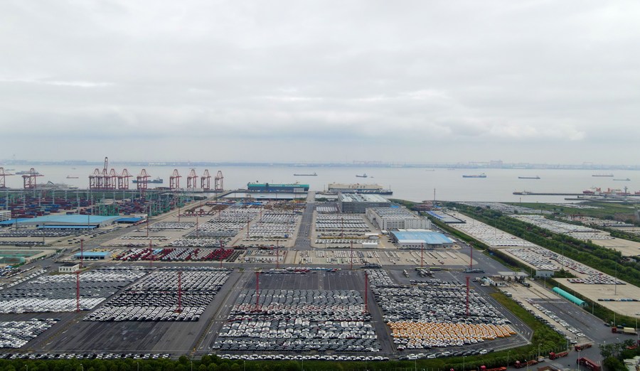 This aerial photo taken on May 25, 2022 shows a view of the Shanghai Haitong International Automotive Terminal in Waigaoqiao of east China's Shanghai. (Xinhua/Fang Zhe)